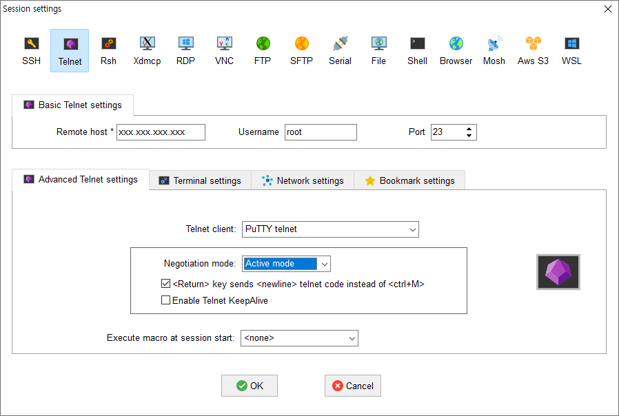2) Telnet 선택 후 호스트IP와 유저이름(root) 입력후 OK