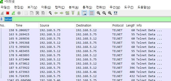 4) Wireshark 이더넷 접속 후 필터에 Telnet 입력해 스니핑 하면 완료!