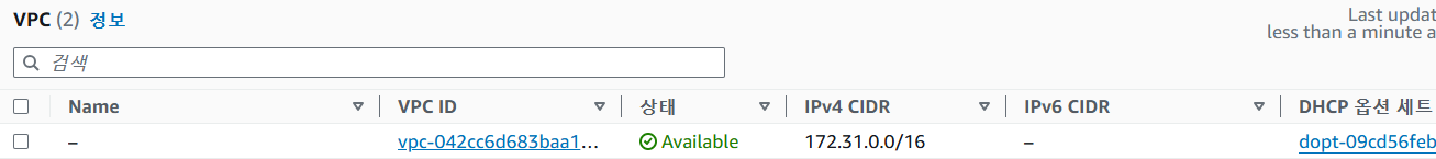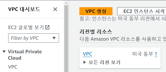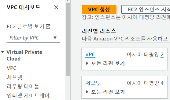 리전별 리소스 -> VPC : 현재 만들어져 있는 VPC 확인