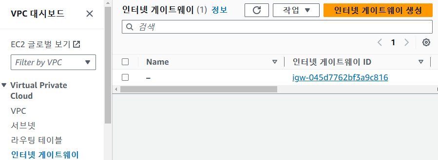 VPC 대시보드 -> 인터넷 게이트웨이 -> 인터넷 게이트웨이 생성