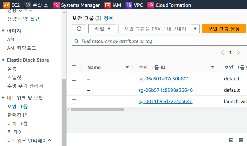 EC2 대시보드 -> 네트워크 및 보안 -> 보안 그룹 -> 보안 그룹 생성 선택