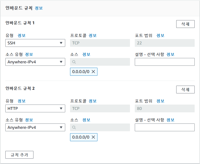 인바운드 규칙 -> 규칙 추가 선택 후