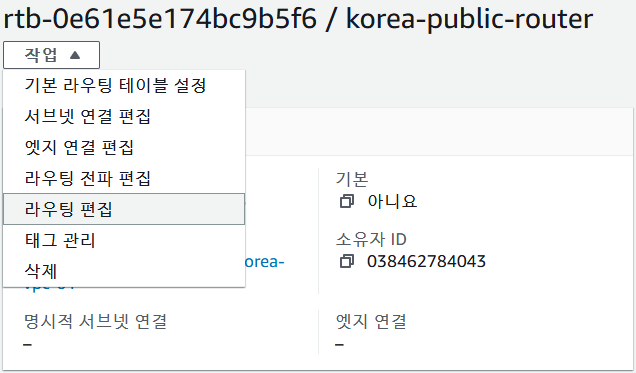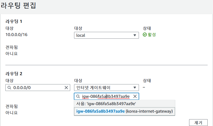 - 대상2 : 인터넷 게이트웨이 -> 생성했던 인터넷 게이트웨이 선택