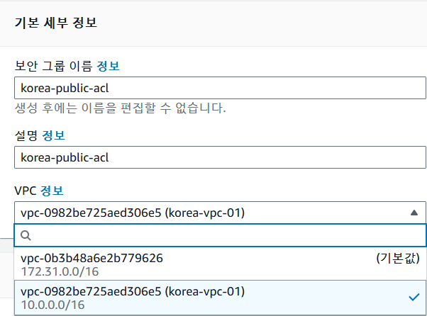 이름 및 VPC 선택