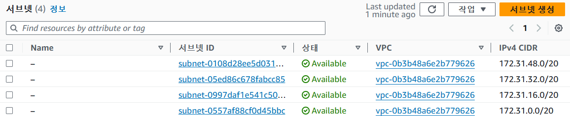 현재 생성되어 있는 서브넷 목록이 표시됩니다.