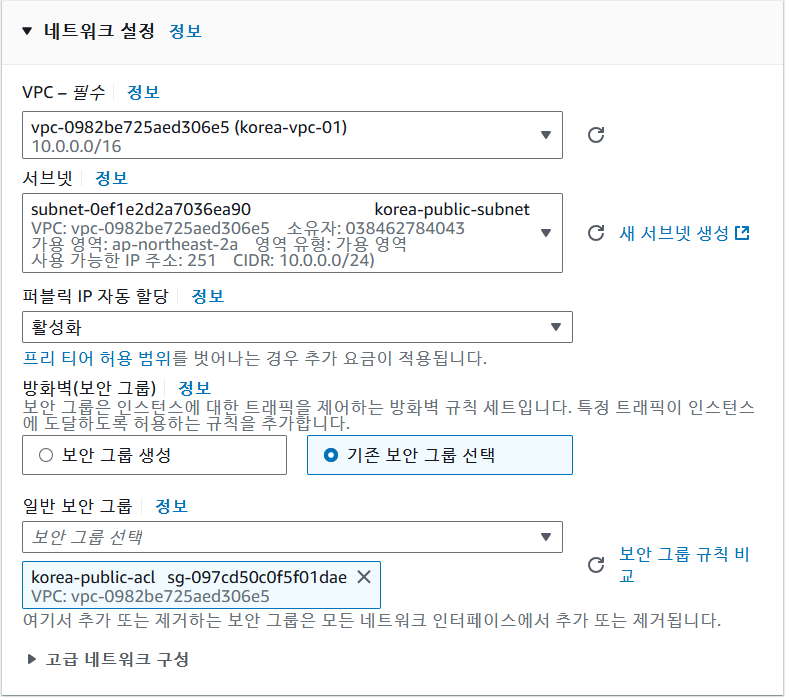 VPC, 서브넷, 보안 그룹을 생성했던 규칙들로 설정해주기