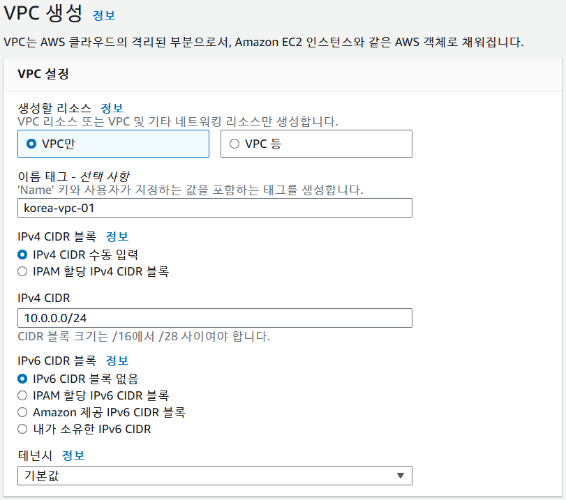 VPC의 이름과 CIDR 대역을 작성