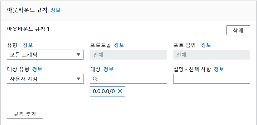 - 대상 : 0.0.0.0/0 (기본 네트워크)