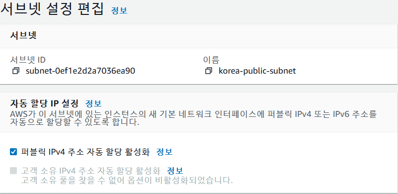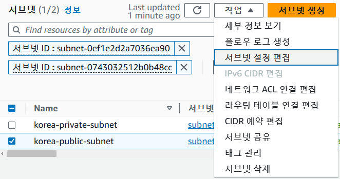 첫번째 서브넷(public) 선택 후 -> 작업 -> 서브넷 설정 편집