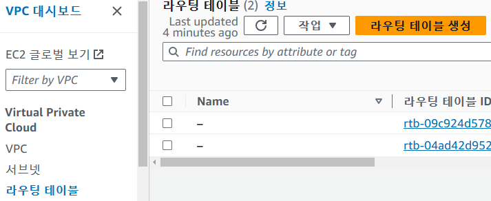 VPC 대시보드 -> 라우팅 테이블 -> 라우팅 테이블 생성