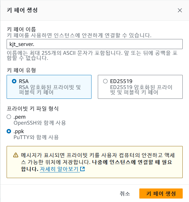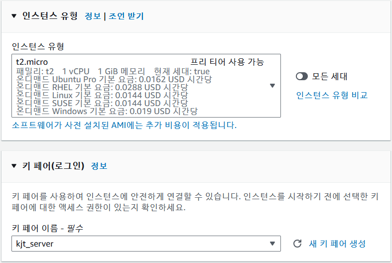 인스턴스 유형 및 키 페어 선택