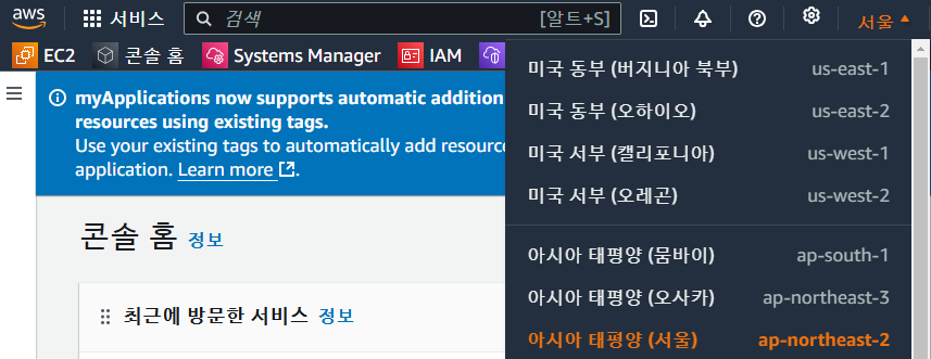 리전 -> 아시아 태평양(서울) 선택