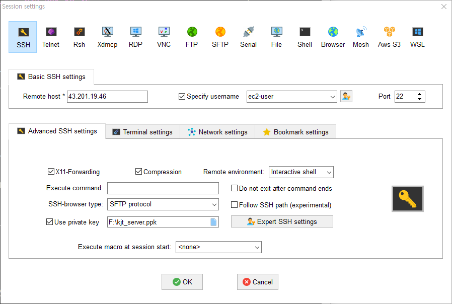 MobaXterm으로 다음과 같이 세션을 생성하여 접속할 수 있습니다.