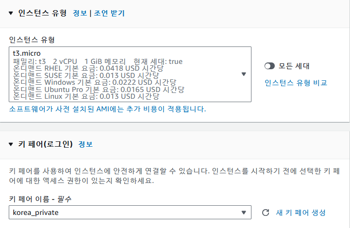 인스턴스 유형: t3.micro (해당 유형은 유료이니 주의)