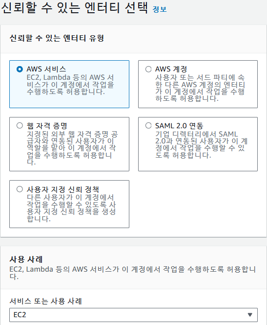 엔터티 유형은 AWS 서비스, 사용사례는 EC2로 진행