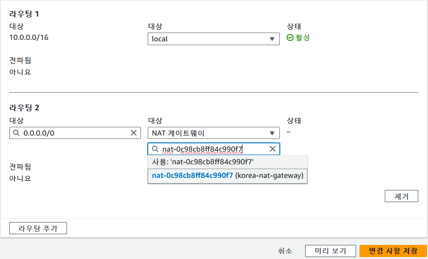 대상 : NAT 게이트웨이 -> 생성했던 nat-gateway 선택