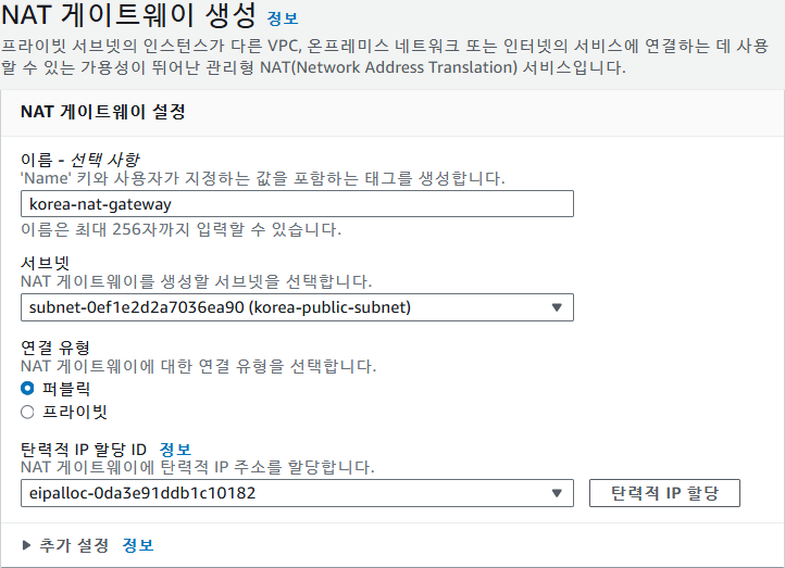 VPC 대시보드 -> NAT 게이트웨이 -> NAT 게이트웨이 생성