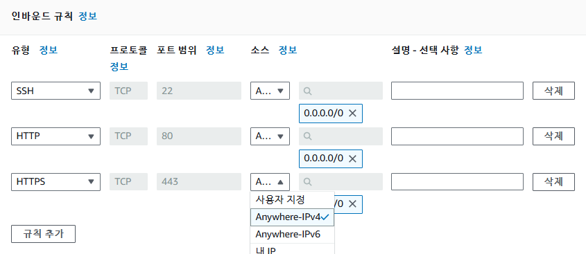 인바운드 규칙 -> 규칙 추가