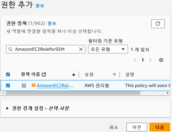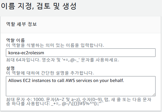 AmazonEC2RoleforSSM 검색하여 체크 후 진행