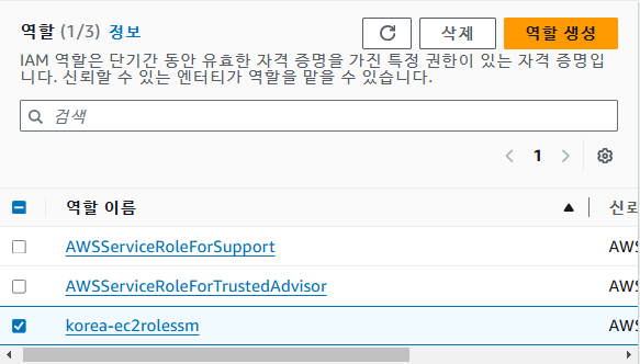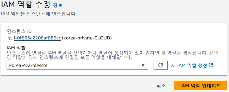 생성했던 ec2rolessm 선택 후 IAM 역할 업데이트