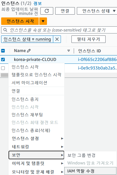 생성했던 private 인스턴스를 오른쪽 클릭 -> 보안 -> IAM 역할 수정