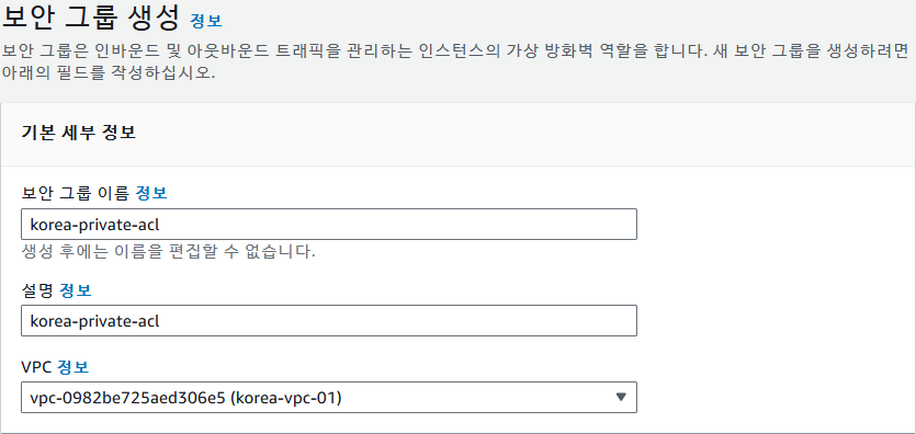 VPC 대시보드 -> 보안 그룹 -> 보안 그룹 생성