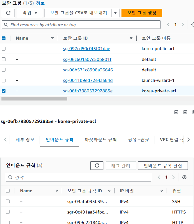 EC2 대시보드 -> 보안 그룹 -> private-acl -> 인바운드 규칙 -> 인바운드 규칙 편집 선택