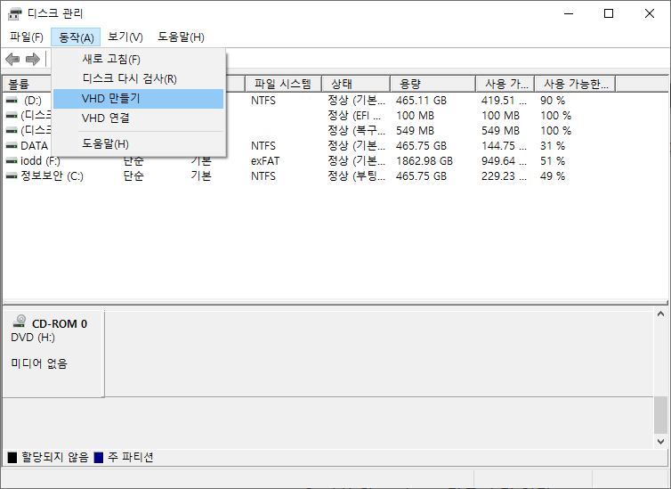 1. 디스크 관리 -> 동작 메뉴 -> VHD 만들기