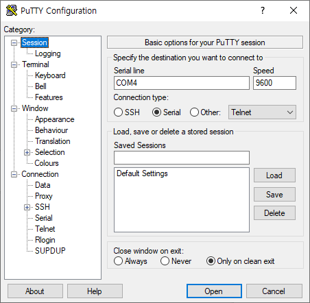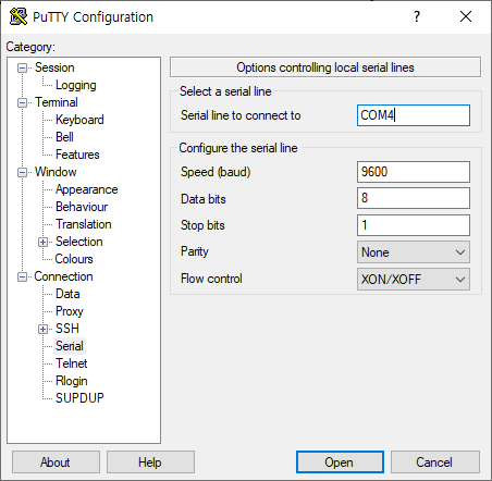 PuTTY 에서 Connection -> Serial 메뉴 선택 후