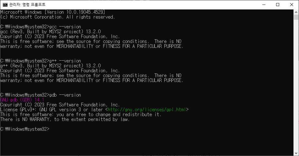 MinGW가 잘 설치되었는지 확인하려면 cmd 창을 열고 다음을 입력합니다.