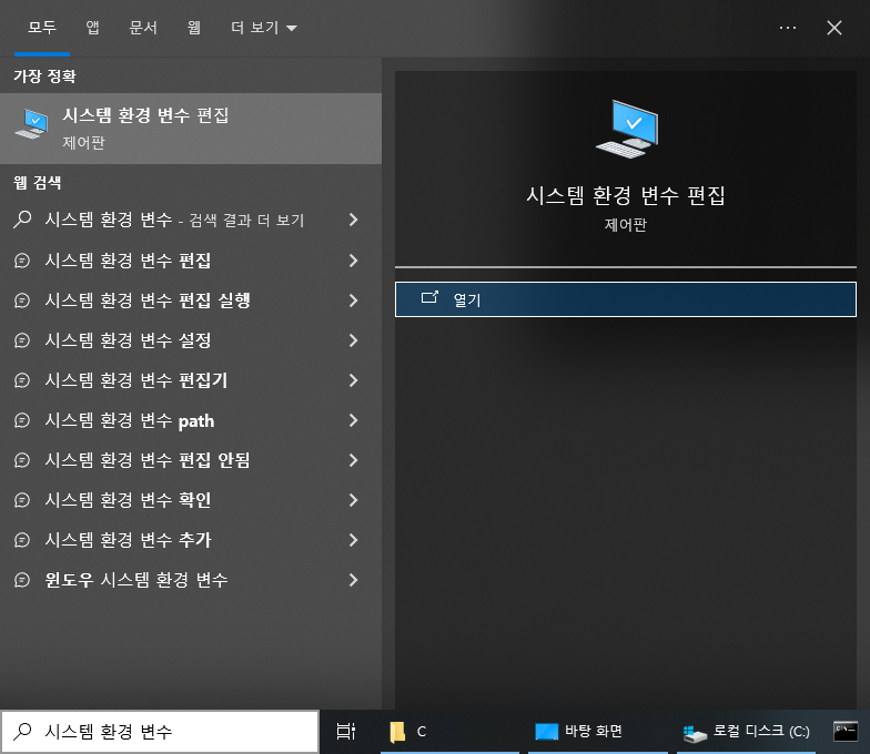 win키 + Q를 눌러 윈도우 검색창을 열고 시스템 환경 변수 편집을 검색해 창을 열어줍니다.