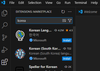 왼쪽 메뉴에서 Extensions를 누르고 한국어 언어팩(Korean Language Pack for Visual Studio Code)을 설치합니다.