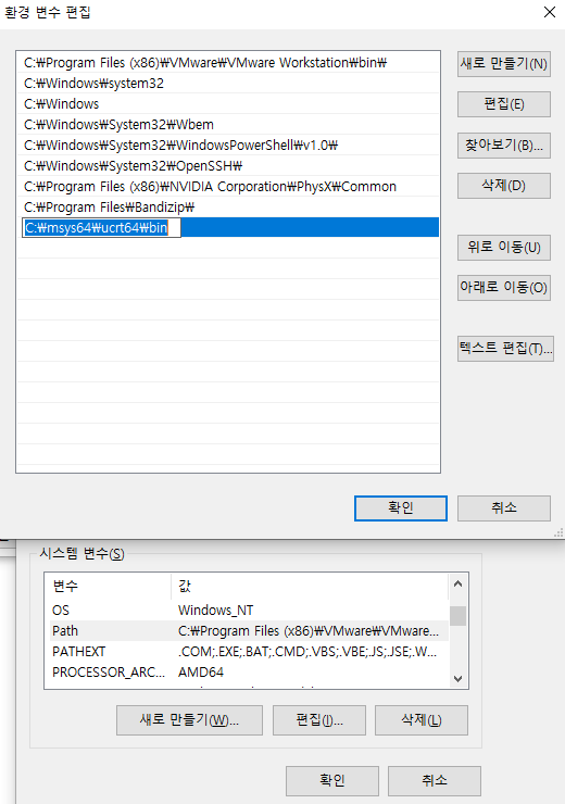 환경 변수 -> 시스템 변수 -> Path 변수를 선택한 후 편집 -> 새로 만들기를 누른 후