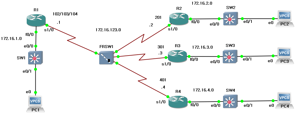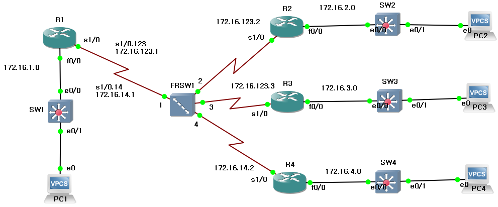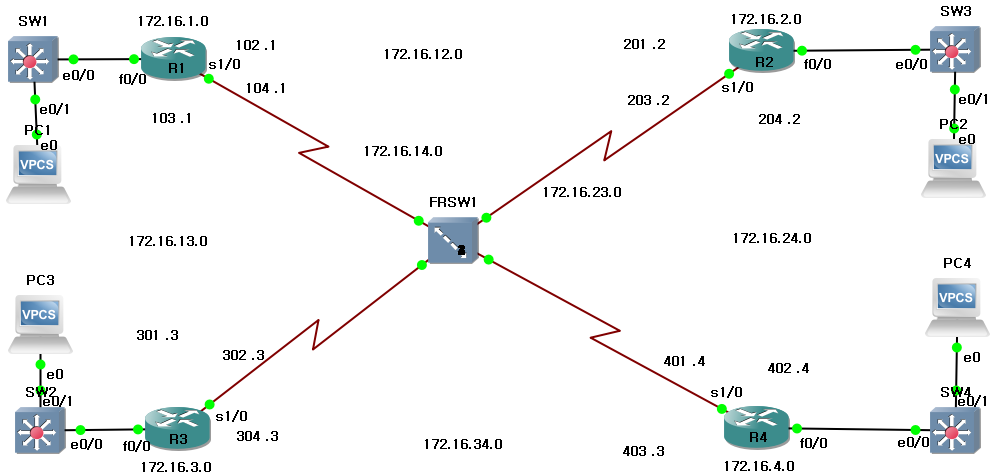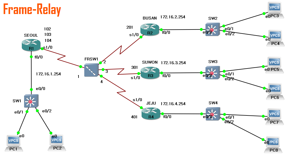 다음과 같은 네트워크를 전부 Frame-Relay의 Point-to-Point 방식으로 연결해 보세요.