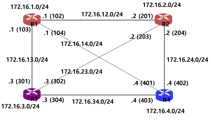 R2 - R4, R3 - R4는 통신이 가능합니다.