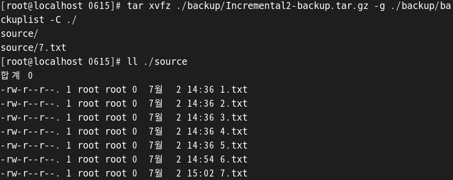 그 속에는 1차 증분백업 이후에 추가한 7.txt파일만 추가됩니다.
