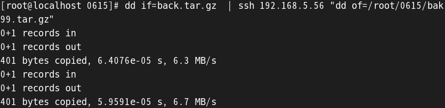 dd if=back.tar.gz | ssh 192.168.5.56 "dd of=/root/0615/bak99.tar.gz"