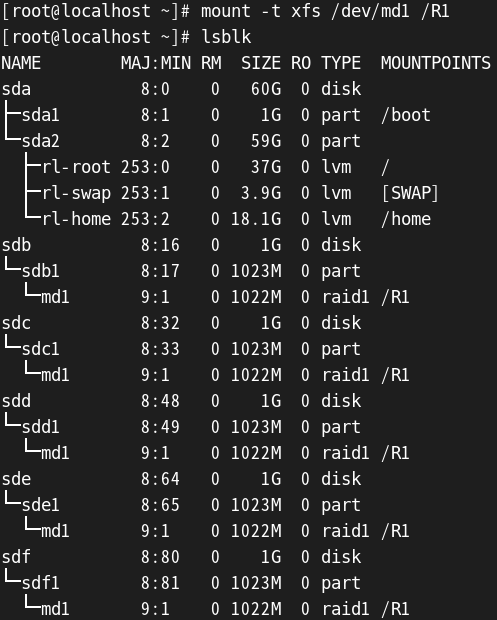 # /R0 폴더를 생성해 xfs 타입의 md0 레이드와 마운트