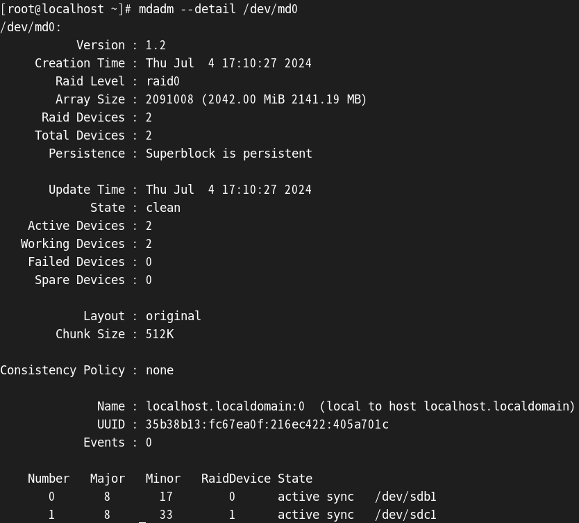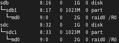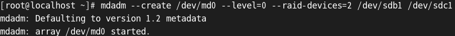 mdadm --create /dev/md0 --level=0 --raid-devices=2 /dev/sdb1 /dev/sdc1