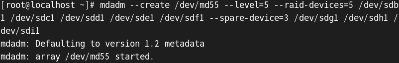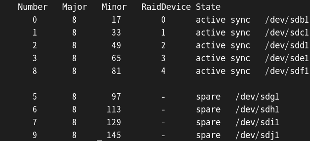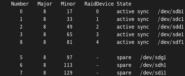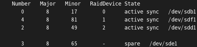 mdadm --create /dev/md1 --level=1 --raid-devices=3 /dev/sdb1 /dev/sdc1 /dev/sdd1 --spare-devices=2 /dev/sde1 /dev/sdf1
