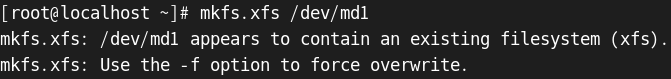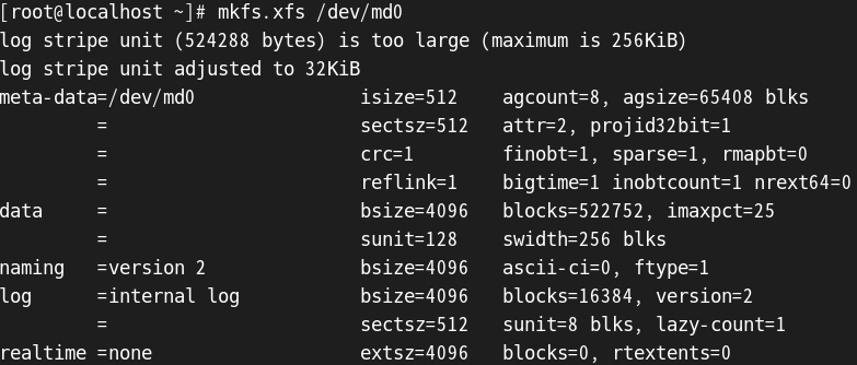 # md0 레이드를 xfs 타입의 파일시스템으로 생성
