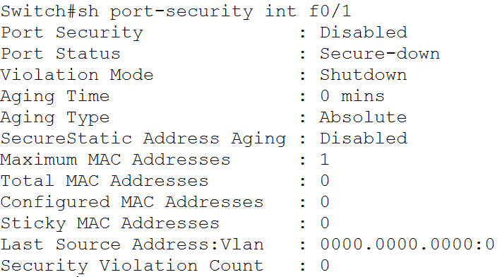 # shutdown : 비활성화(err-disabled), 활성화하려면 shutdown , no shutdown을 차례로 입력