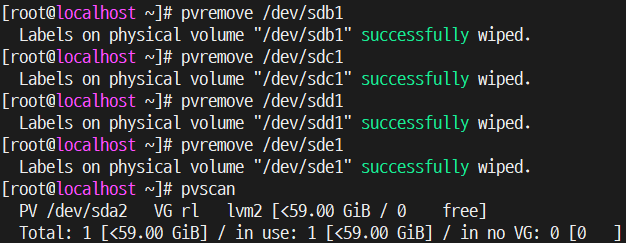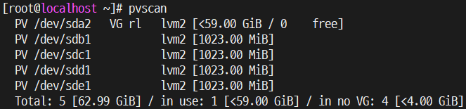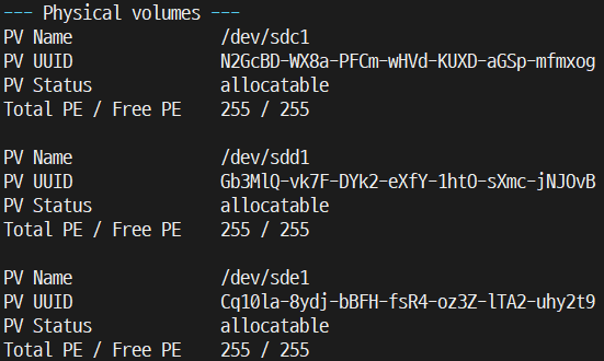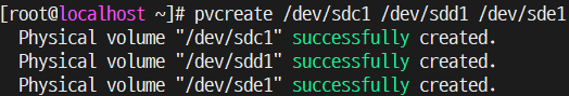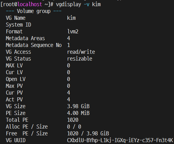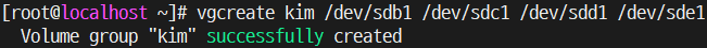 vgcreate kim /dev/sdb1 /dev/sdc1 /dev/sdd1 /dev/sde1