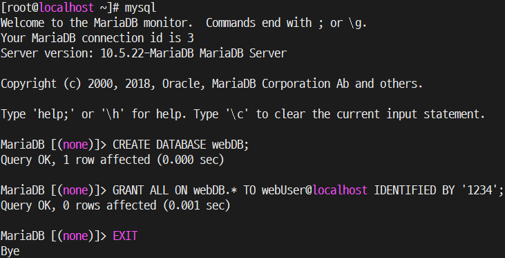 GRANT ALL ON webDB.* TO webUser@localhost IDENTIFIED BY '1234';