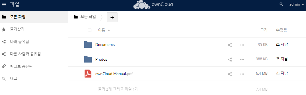 를 입력하면 ownCloud로 접속할 수 있습니다.