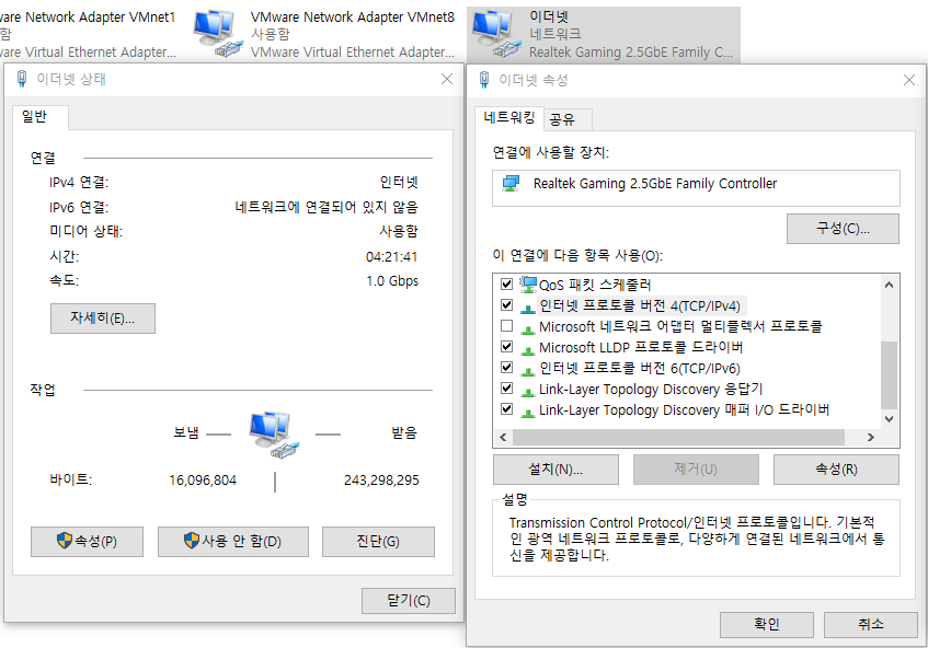 네트워크 연결 -> 사용중인 이더넷 네트워크 -> 속성