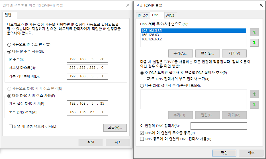 고급(V)... -> DNS 탭 -> 추가(A)... -> 리눅스 서버 IP 추가