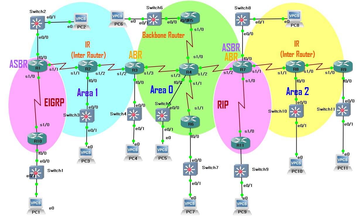 R1 - ASBR : 2개의 라우팅 정보를 갖고 있는 라우터)