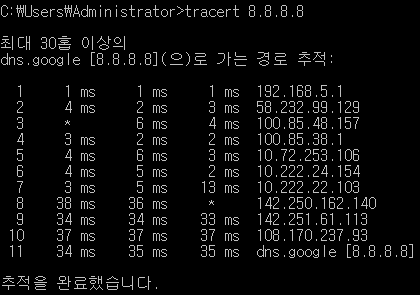 tracert 명령어로 특정 IP로 가는 경로를 추적할 수 있습니다.