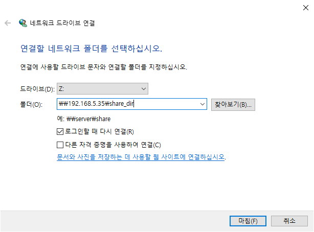 마운트할 드라이브와 공유폴더를 입력해줍니다.